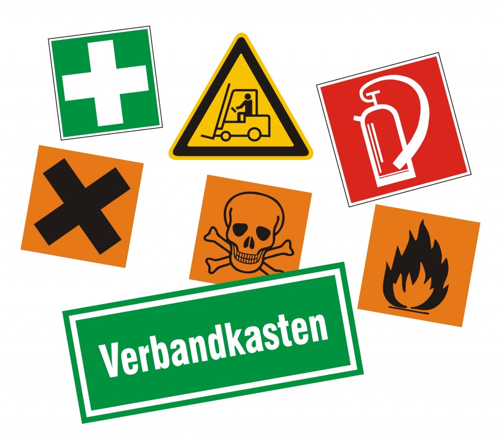 Sicherheitskennzeichnungen nach den Richtlinien der Unfallverhütungsvorschrift zur Sicherheits- und Gesundheitsschutzkennzeichnungen.