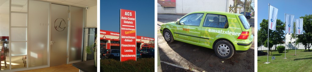 Schaufensterbeschriftungen, Gerüstbanner, Roll-Up-Banner, Schilder und Schilderanlagen, Fahrzeugbeschriftung und -vollverklebung, Stelen und Pylonen (beleuchtet und unbeleuchtet), Leuchtwerbeanlagen, Digitaldruck XXL, Fahnen und Fahnenmasten, Beachflags, Messestände, Folientexte, Sichschutzfolie,  Wandtattoos,  Klingelschilder und vieles mehr...